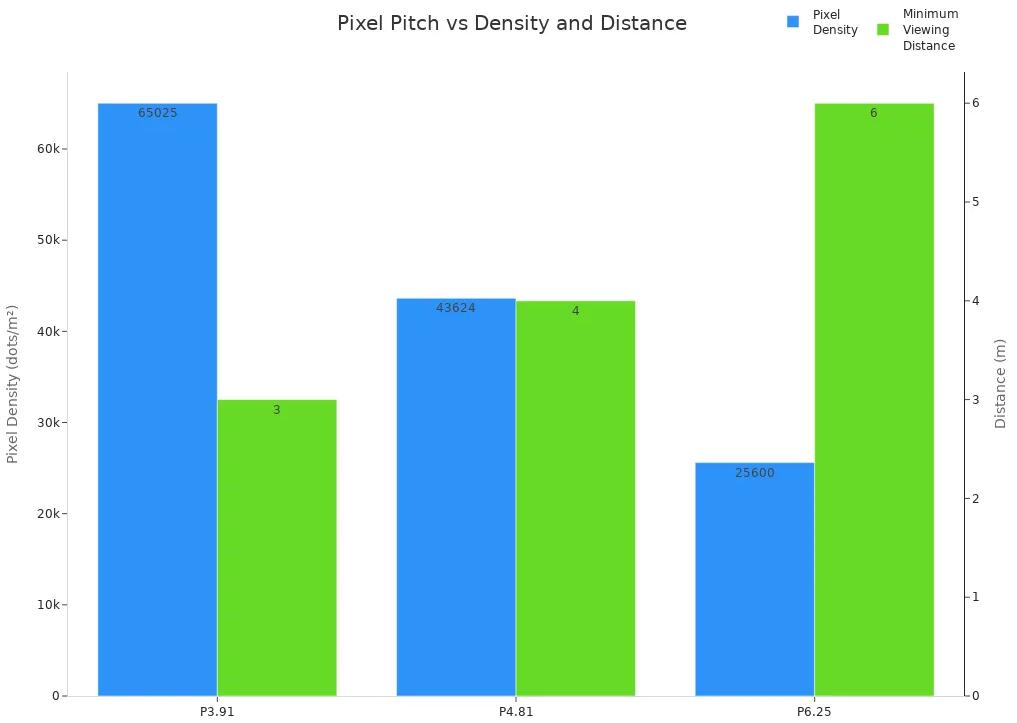 الدقة العالية تجعل صورك تبدو أكثر وضوحًا. إذا كان الناس يقفون بعيدًا، يمكنك استخدام دقة أقل. لوحات الإعلانات على الطرق السريعة تعمل بشكل جيد مع عدد أقل من وحدات البكسل. أما للمشاهد القريبة، كما هو الحال في الساحات العامة أو مراكز التسوق، فأنت بحاجة إلى دقة عالية. هذا يجعل شاشة LED الخاصة بك تبدو أفضل ويجذب انتباه الناس.