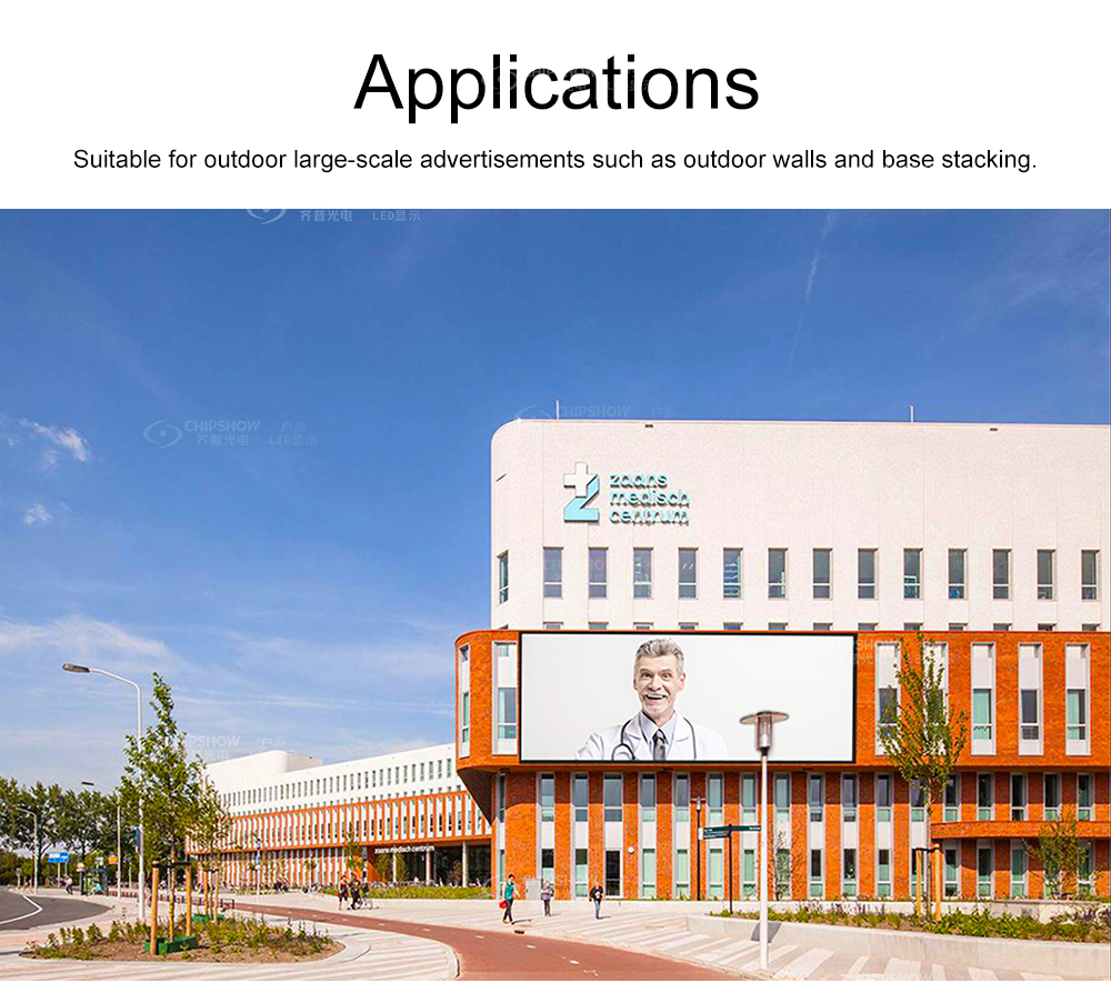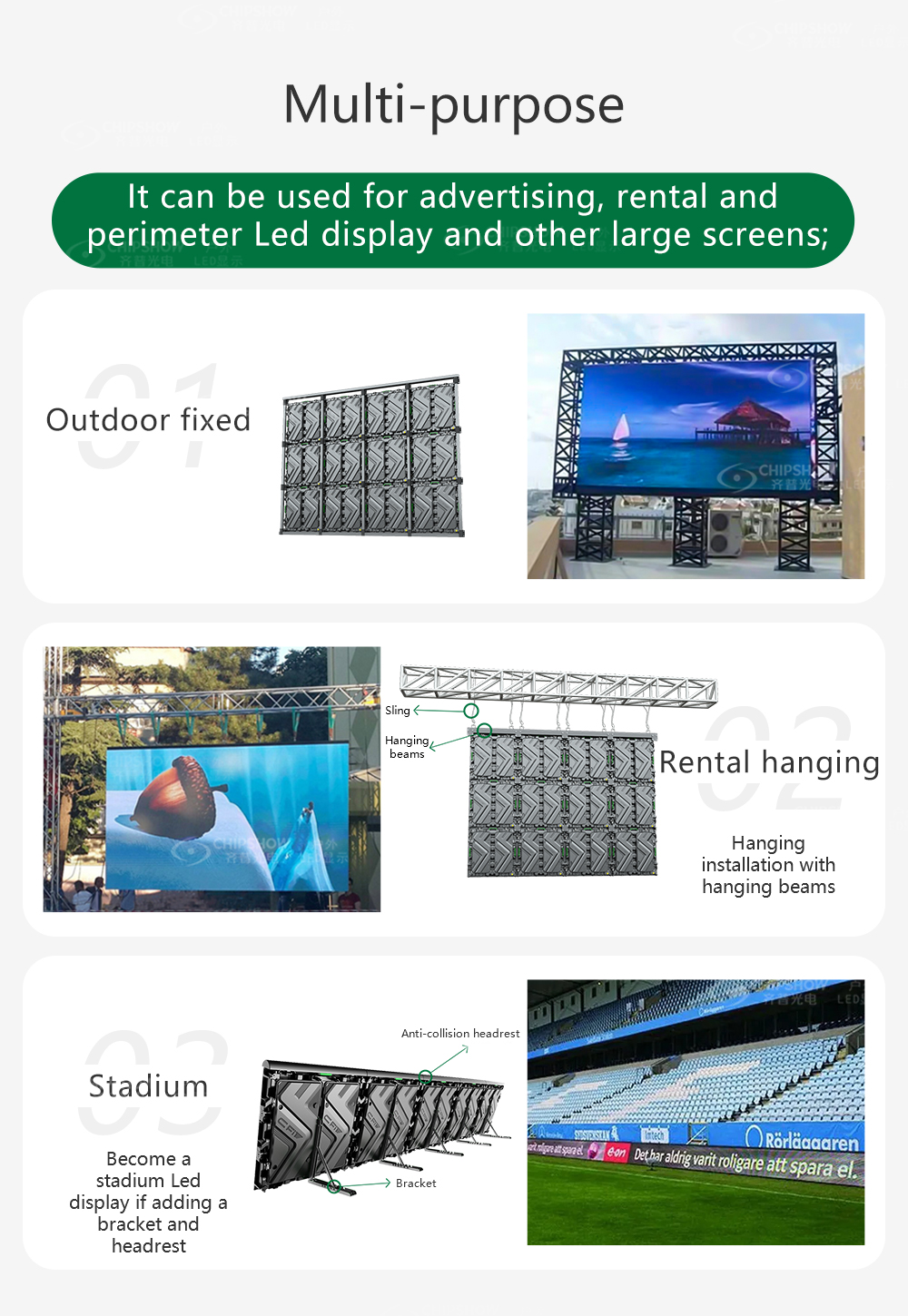3 أغراض متعددة: يمكن لشاشة Billboard C-FIT يمكن استخدامها كحل عرض ثابت فعال من حيث التكلفة ، وحل عرض الإيجار الذي يدعم التثبيت المعلقة ، وحل عرض أسوار محيط الاستاد ؛
