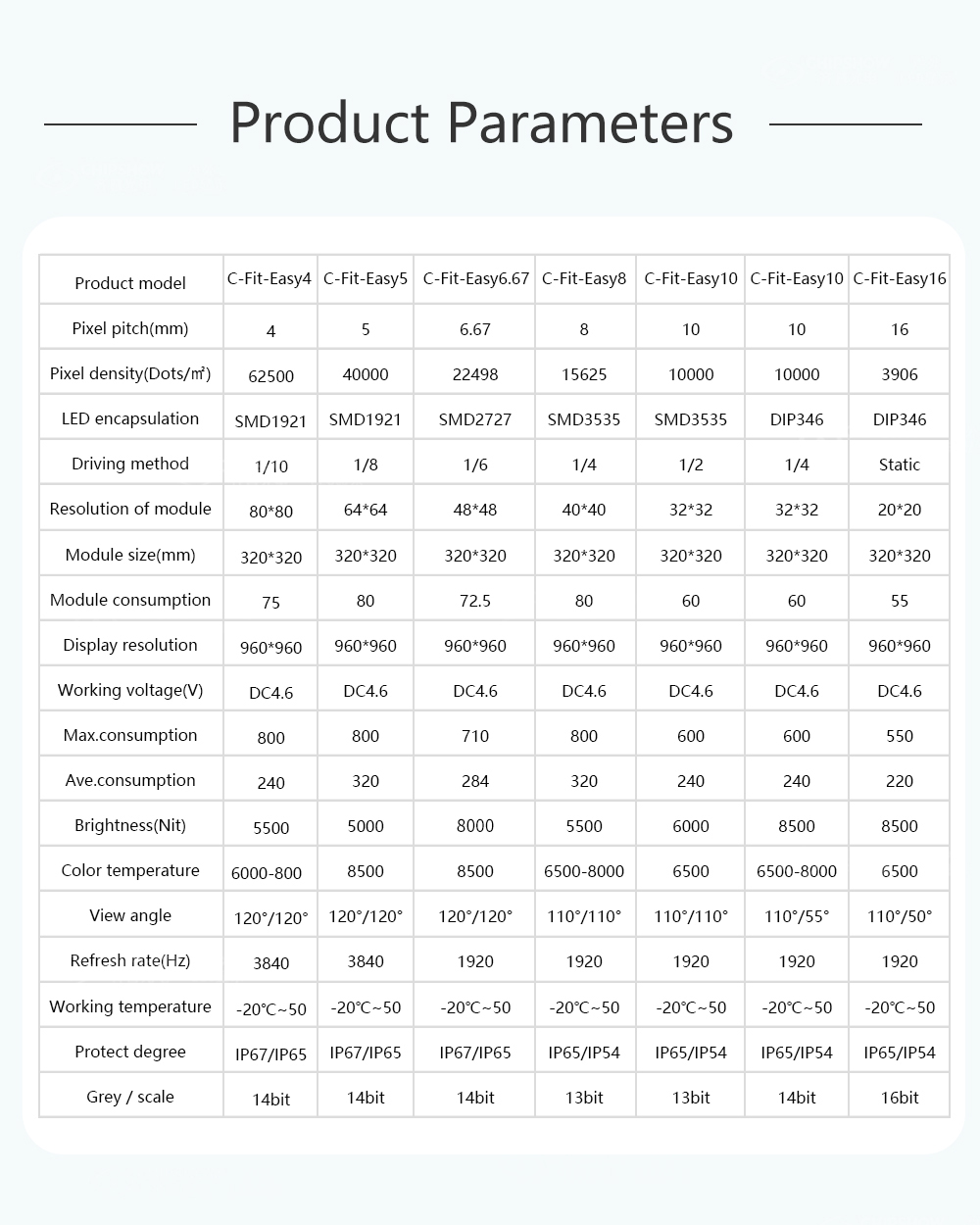 7 درجة عالية من الحماية: تصل درجة الحماية من سلسلة C-Fit-Sonsy IP65 ؛ وهذا النوع من شاشة Billboard مناسب جدًا للإعلانات الخارجية ذات التنسيق الكبير ، مثل LED في الهواء الطلق الجدران ، وشاشات LED مع نظام مكدس الأرض ؛