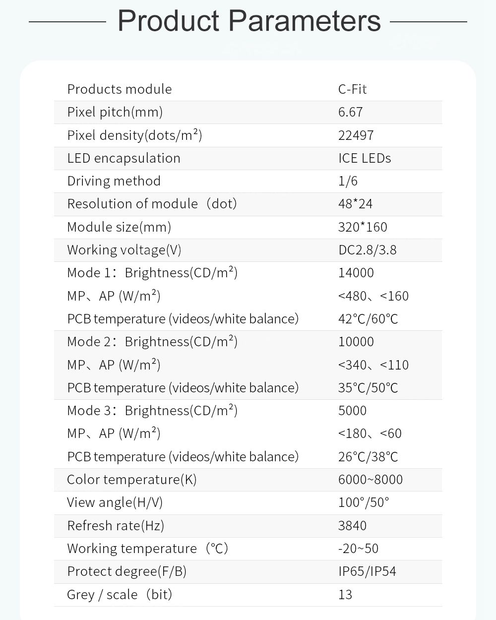درجة البكسل، معدل الدقة، الحجم: 5 مم، 12*64 نقطة، 60*320 لون البكسل، بكسل LEDL: 1R1G1B، SMD1921 جهد العمل، طاقة الوحدة: DC4.6V، ≥10W القيادة IC 、 طريقة القيادة التكوين القياسي: ICND2153 、 1/8 المحور: HUB75 المواد، وزن الخزانة (كجم/خزانة): صفائح معدنية من الألومنيوم، 15 كجم/خزانة معدل الدقة، الحجم، كمية الوحدة: 120*192 نقطة، 600*960*95 ملم، 10X3 الكثافة: 40000 نقطة/㎡ توازن اللون الأبيض، درجة حرارة اللون: 5000CD/㎡،6000-8000K عرض الملاك 、 عدم التسطيح 、 الفاصل الزمني للوحدة H / V: 120 درجة / 120 درجة 、 <0.2 مم 、 <0.2 مم الطاقة القصوى /㎡، متوسط ​​الطاقة /㎡: ≥560 واط/㎡، ≥170 واط/㎡ تردد الإطار، تردد التحديث، الدرجة الرمادية: 60 هرتز، 3840 هرتز، 13 بت نظام التحكم، يدعم النظام CHIPSHOW، Windows XP، WIN 7 درجة حرارة العمل، درجة الحماية: ﹣20~50 درجة مئوية، أمامي/خلفي: IP65/IP54