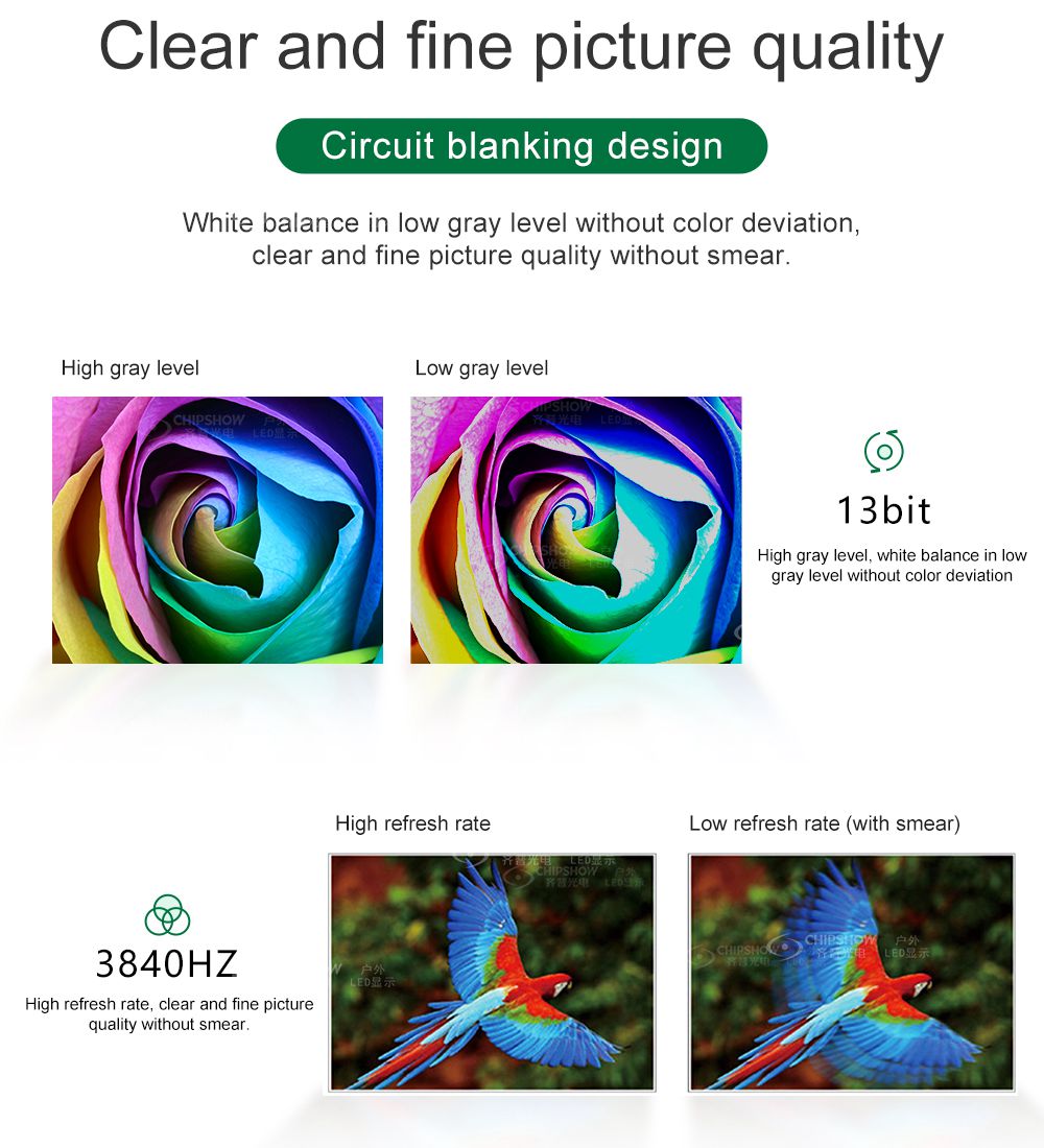 2 جودة الصورة الدقيقة: إنها تستخدم دائرة طمس الحافة الرائدة للتخلص من الخطوط الشبحية بشكل فعال؛ ومع توازن اللون الأبيض تحت مستوى رمادي منخفض، فإنه يحقق جودة صورة جيدة بدون انحراف في اللون؛