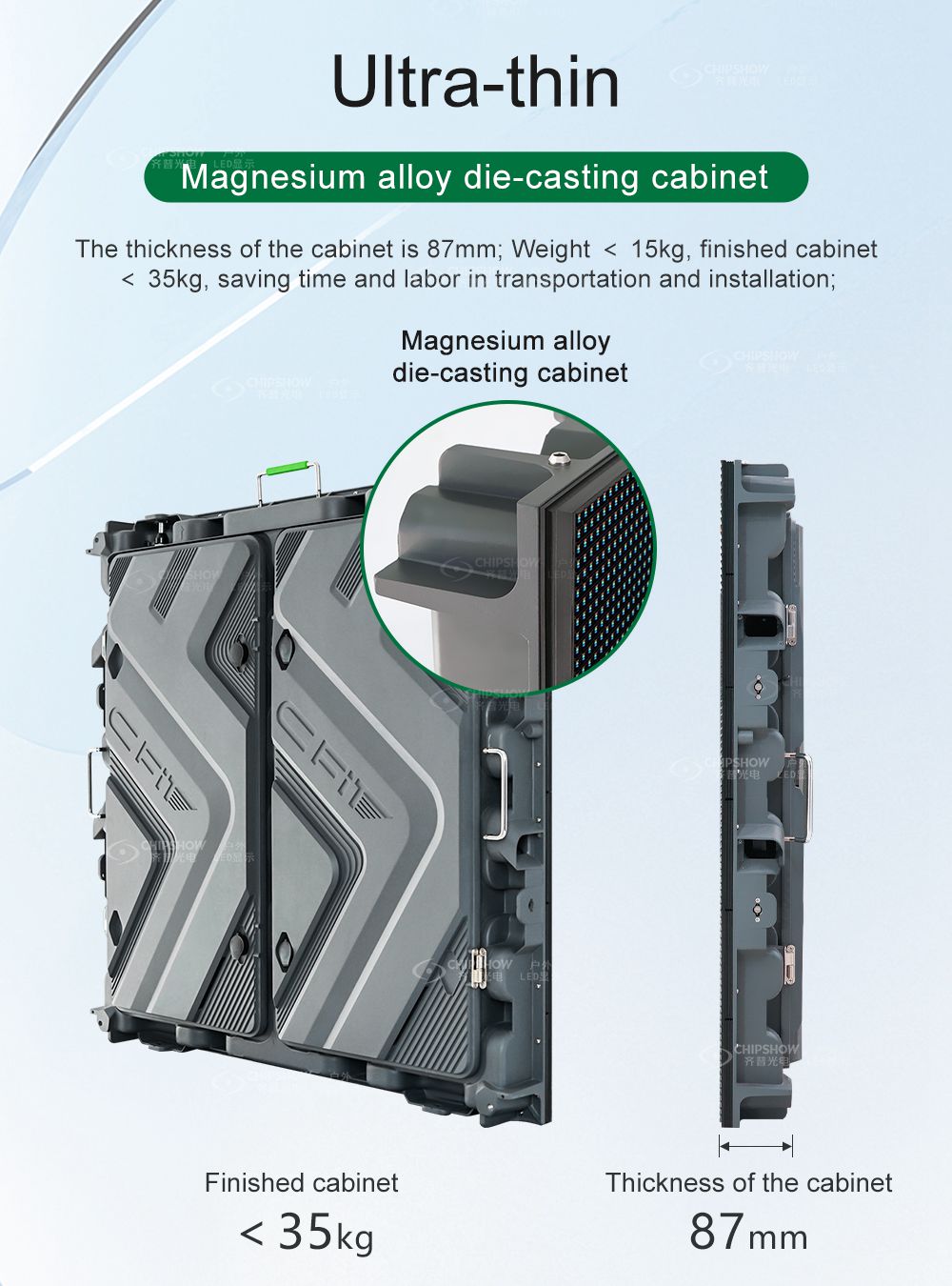 الصيانة الأمامية والخلفية: تدعم جميع المكونات (مثل الوحدات النمطية وبطاقات النظام ووحدات إمداد الطاقة) الخدمة الأمامية؛ مما يوفر لك المساحة أثناء الصيانة؛ كما يدعم أيضًا التثبيت على الحائط؛ أداء جيد مقاوم للماء: يتم تطبيق تقنية مقاومة الماء الجانبية بين الخزانات؛ الوحدات المغلقة بالكامل حاصلة على تصنيف IP-65 لمقاومة الماء وهي مثالية للاستخدام في الهواء الطلق؛ خفيف الوزن ورقيق للغاية: الخزانات مصنوعة من سبيكة المغنيسيوم ذات القوة الممتازة؛ كل خزانة (الحجم: 480 مم * 640 مم) تزن 7.2 كجم فقط؛ ضوضاء منخفضة: تعمل شاشة العرض دون استخدام المراوح، والضوضاء أقل من 25 ديسيبل؛ التثبيت السريع: يستخدم أقفال سريعة ومقابس طيران لإكمال الاتصال والإعداد؛ ويمكن توفير الكثير من العمل والوقت؛ تجميع مرن: يوفر حجم الوحدة الصغير (480 مم * 640 مم) الراحة لمستخدمي تجميع أحجام مختلفة من اللافتات/اللافتات/اللوحات الإعلانية؛ كما أنه يدعم الوصل مع خزانات C-Slim كبيرة الحجم (الحجم: 960 مم * 960 مم)؛ على سبيل المثال، يمكن وصل شاشة عرض بنسبة عرض إلى ارتفاع 16:9 بسهولة؛ التطبيق: يمكن استخدامه على نطاق واسع لمجموعة واسعة من مشاريع الإعلان/البث الخارجية، مثل الإعلان/البث في المسابقات الرياضية، والإعلان عن العقارات، والدعاية لصور الحكومة/المؤسسات، وما إلى ذلك؛