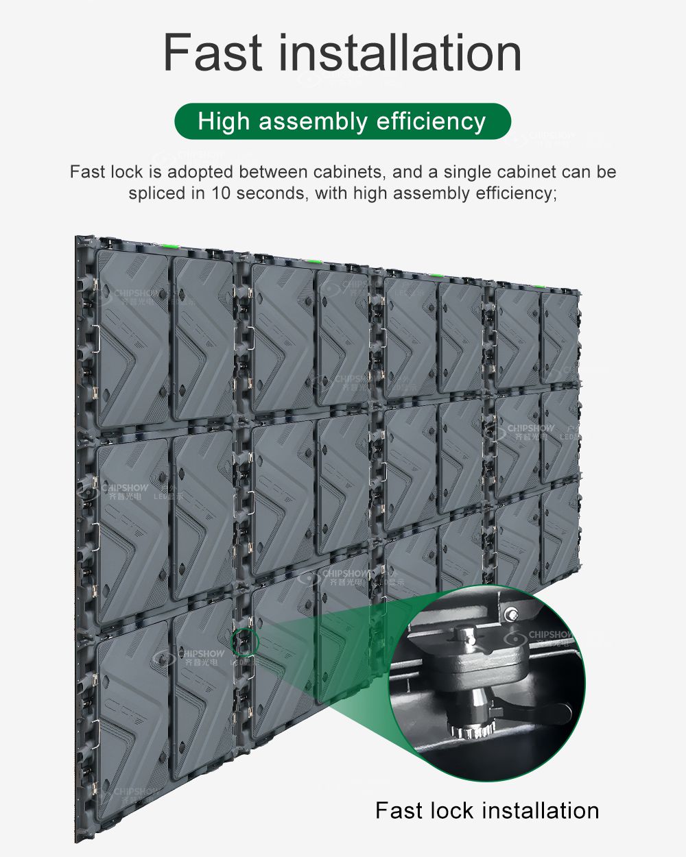 6 تبديد الحرارة عالي الكفاءة: يضمن نظام تبديد الحرارة المتطور ذاتيًا إمكانية تبديد الحرارة في أي ركن من أركان الخزانة بسرعة من خلال الضغط الحالي المزدوج والضغط السلبي. وهذا يضمن أن شاشة LED يمكن أن تعمل دائمًا بشكل طبيعي دون مشاكل تبديد الحرارة 7 تركيب سريع: كل خزانة متصلة بأقفال سريعة، ويستغرق الأمر 10 ثوانٍ فقط لربط خزانتين؛