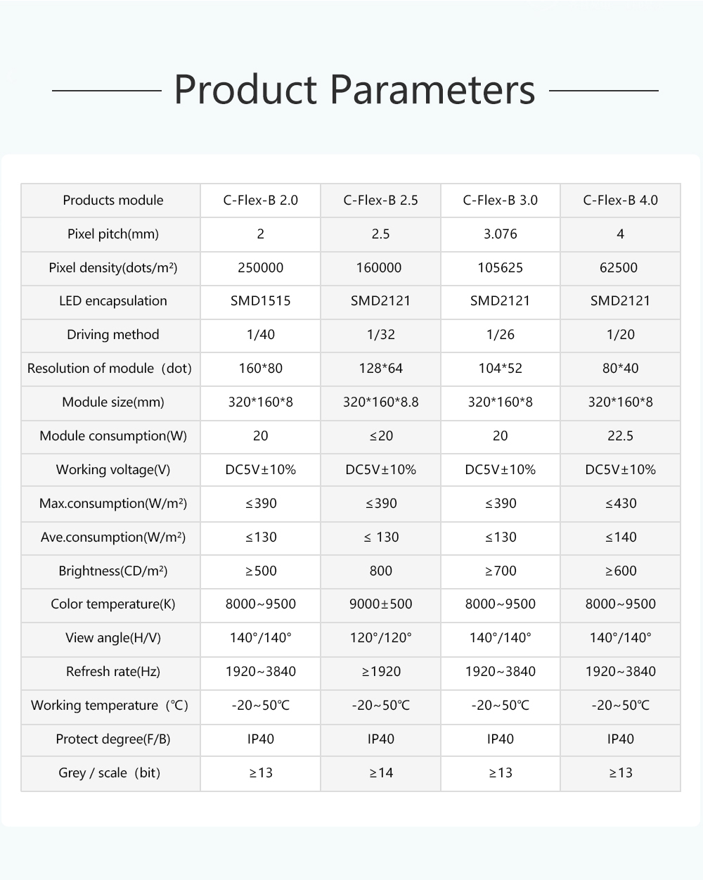 1 سلسلة c-flex مرنة جدًا؛ يمكن أن تدعم مجموعة كبيرة من زوايا الانحناء؛ يمكن ربط وحدات LED المرنة المتعددة c-flex معًا لتشكيل شاشات عرض ذات أشكال مختلفة وفقًا لاحتياجات مشروعك، مثل الشاشات ذات الشكل المنحني، والأسطواني، والقوس؛