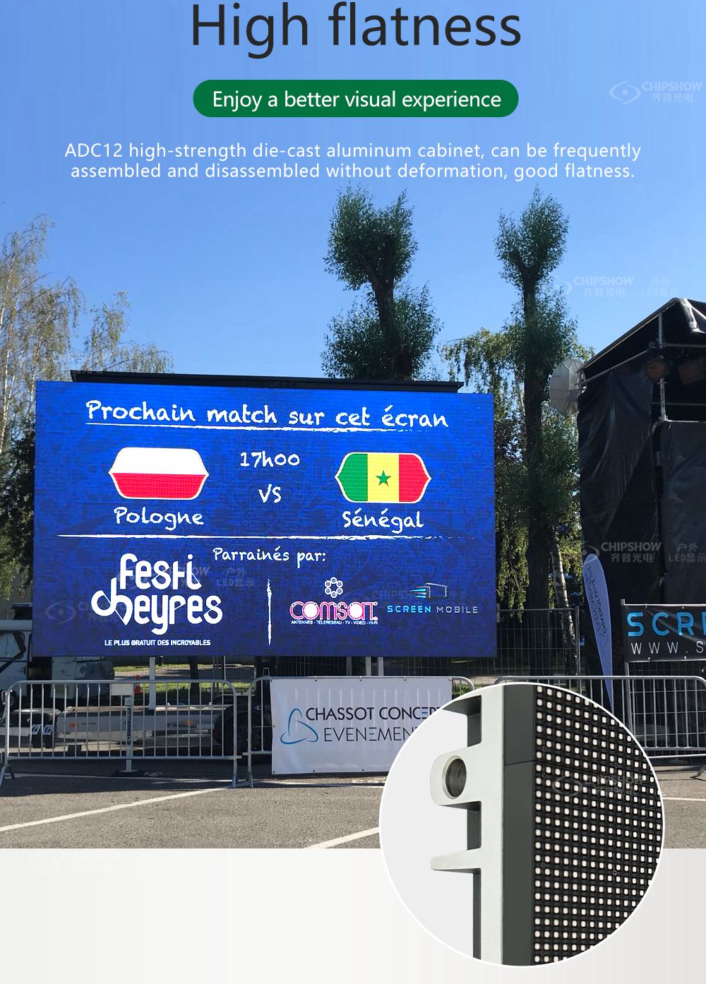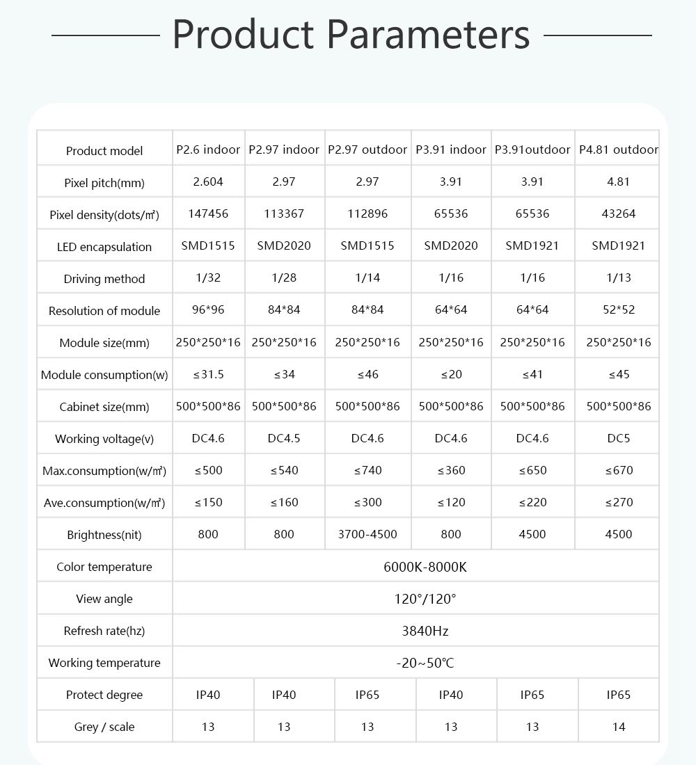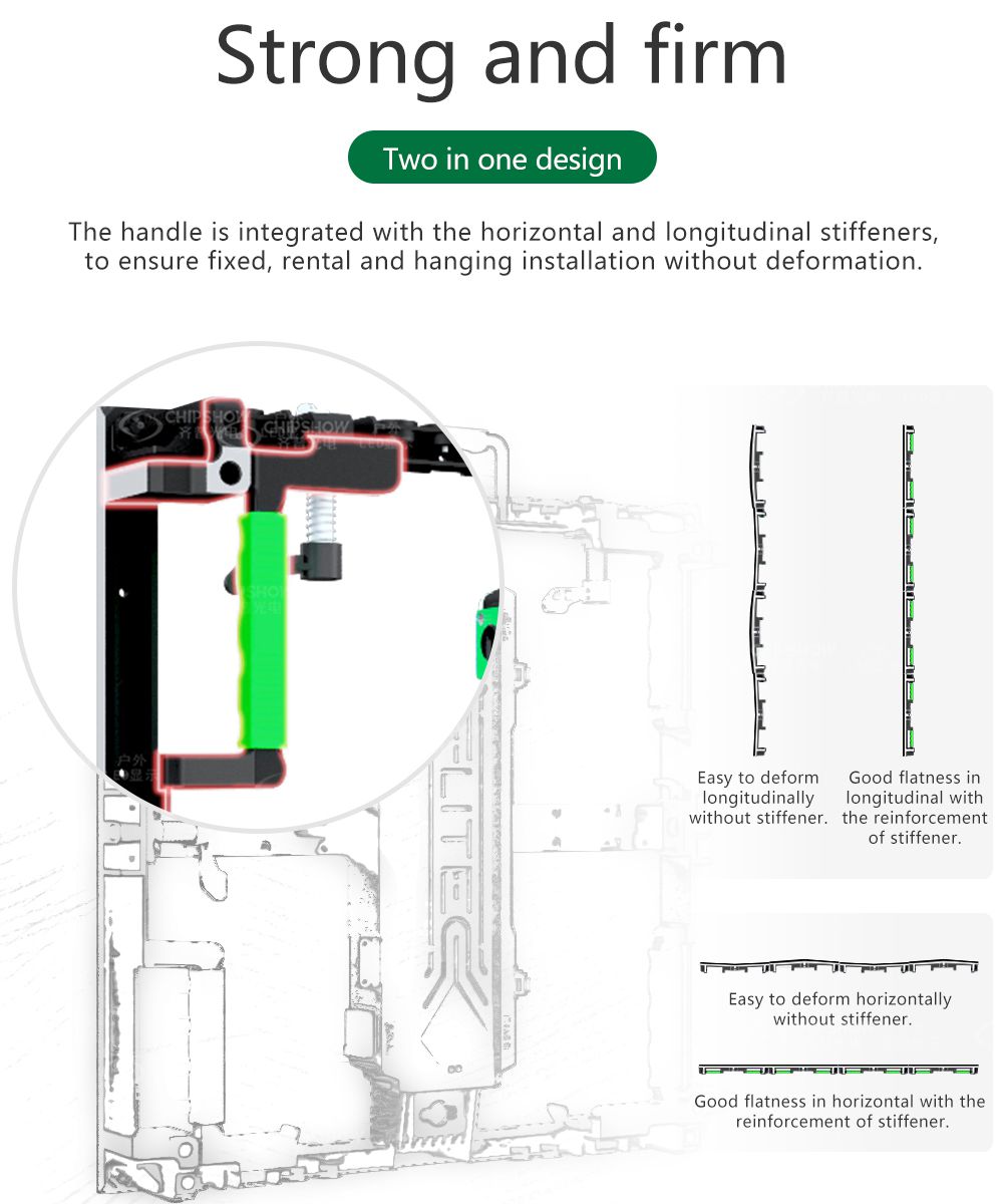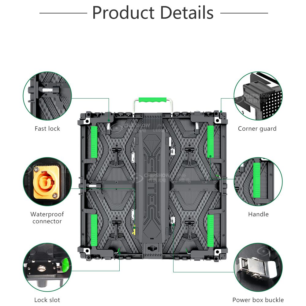 ١. تسطيح جيد: الشاشات مصنوعة من خزانات من الألومنيوم المصبوب (قوة الشد: ADC-12) للاستخدامات الإيجارية. يمكن تجميع الخزانات وتفكيكها بشكل متكرر دون أي تشوه.