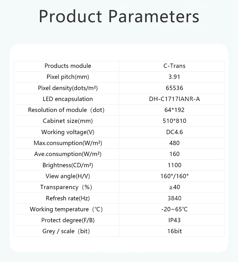 مع خصائص معدل الشفافية العالي، والتركيب غير المرئي، والخفيف جدًا والرفيع، فهو جيد جدًا لمساعدة العلامات التجارية التجارية. مزايا 1. خفيف للغاية ورقيق، الجزء الشفاف 3 مم فقط؛ 2. استخدام مواد الكمبيوتر المتطورة ذات الشفافية العالية ومقاومة درجات الحرارة العالية وتناسق الألوان الجيد. 3. يمكن للتصميم المثالي الضيق للغاية للوحة الإضاءة PCB أن يحقق معدل شفافية يصل إلى 60% بسهولة. 4. لا يوجد مصدر طاقة للمروحة، هادئ وبدون ضوضاء. 5. يمكن لصقها مباشرة على الزجاج أو التثبيت المعلق، بسرعة وبدون قلق. 6. تصميم مخفي، يتم تخزين جميع الكابلات في صندوق التحكم، مظهر جميل وسخي. 7. يمكن ربط الشاشة إلى اليسار واليمين أو لأعلى ولأسفل، مما يحقق ارتفاع أو عرض للشاشة يبلغ 1.92 متر وربط غير محدود في الاتجاه الآخر. تثبيت يتم لصقها مباشرة على الزجاج الشفاف أو التثبيت المعلق طلب حدث مسرحي، مركز تسوق، سلسلة متاجر، متحف العلوم، نافذة زجاجية، بناء حائط ساتر زجاجي، صناعة التأجير، تجارة التجزئة الجديدة، إلخ.