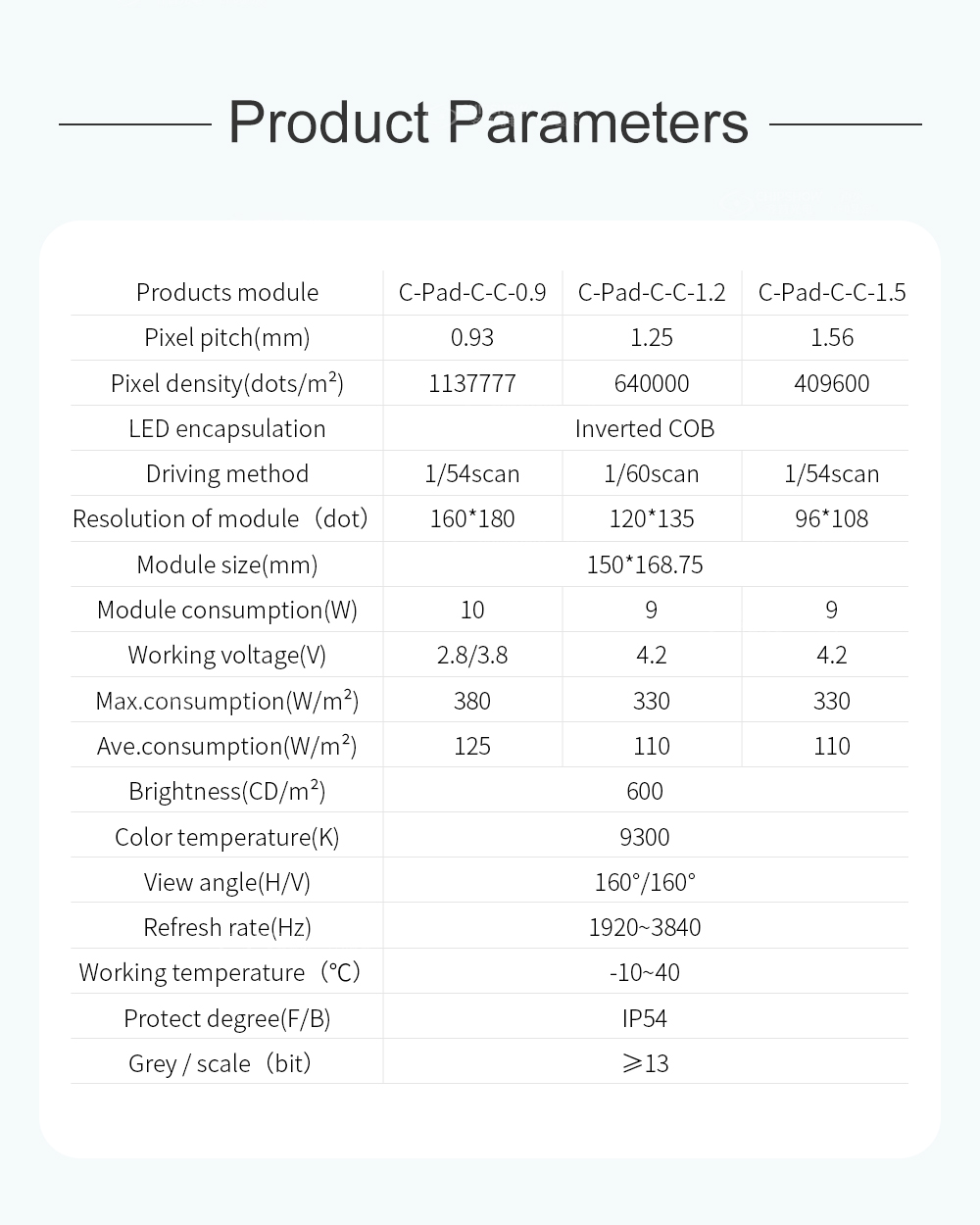 1، موثوقية عالية: مناسبة لوحدات COB p0.9 p1.2 p1.5، مقاومة للرطوبة، مضادة للتصادم، سطح مضاد للكهرباء الساكنة، مقاومة لبصمات الأصابع، يمكن تنظيف سطح LED بسلاسة بقطعة قماش.