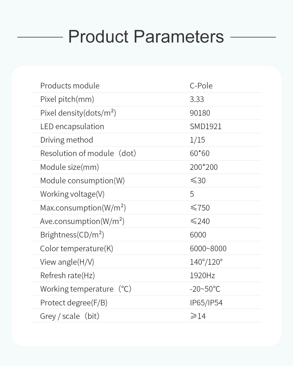 سمات: 1 الإضاءة الذكية: يمكن لسلسلة C-Fit-Pole ضبط اللون والسطوع تلقائيًا لتحسين تأثيرات الإضاءة واستهلاك الطاقة، وفقًا للظروف المحلية (مثل المناخات الإقليمية والسطوع البيئي)؛ 2 المراقبة الذكية: يمكن لسلسلة C-Fit-Pole اكتشاف الدخان والرطوبة ودرجة الحرارة وPM 2.5؛ كما أنه يدعم التعرف على الوجه، ومفاتيح الطاقة عن بعد، والتفاعل السمعي والبصري؛ 3 بث الأخبار: عمود الإضاءة الذكي مزود بوحدة تحتوي على وظيفة بث الشبكة؛ وفي حالة الطوارئ، يمكن لعمود الإنارة أن يبث الأخبار إلى الناس في المنطقة المجاورة له؛ 4 جهاز تحكم عن بعد لشبكات 4G/5G: مع سلسلة C-Fit-Pole، يمكنك إنشاء شبكة واسعة النطاق حيث لا يكون عدد شاشات LED القطبية محدودًا؛ بالإضافة إلى ذلك، فإن نقل البيانات عالي السرعة يجعل من السهل إرسال الرسوم المتحركة ومقاطع الفيديو والصور عالية الدقة؛ 5 تصميم وحدات: تعتمد سلسلة C-Fit-Pole وحدات LED التي تدعم الخدمة الأمامية والخلفية، مما يوفر الراحة للمستخدمين للتثبيت والصيانة؛ 6 درجة حماية عالية: الخزانات مصنوعة من سبائك المغنيسيوم المصبوبة، والجزء الأمامي من الخزانات يصل إلى درجة الحماية IP65، والجزء الخلفي يصل إلى IP64؛
