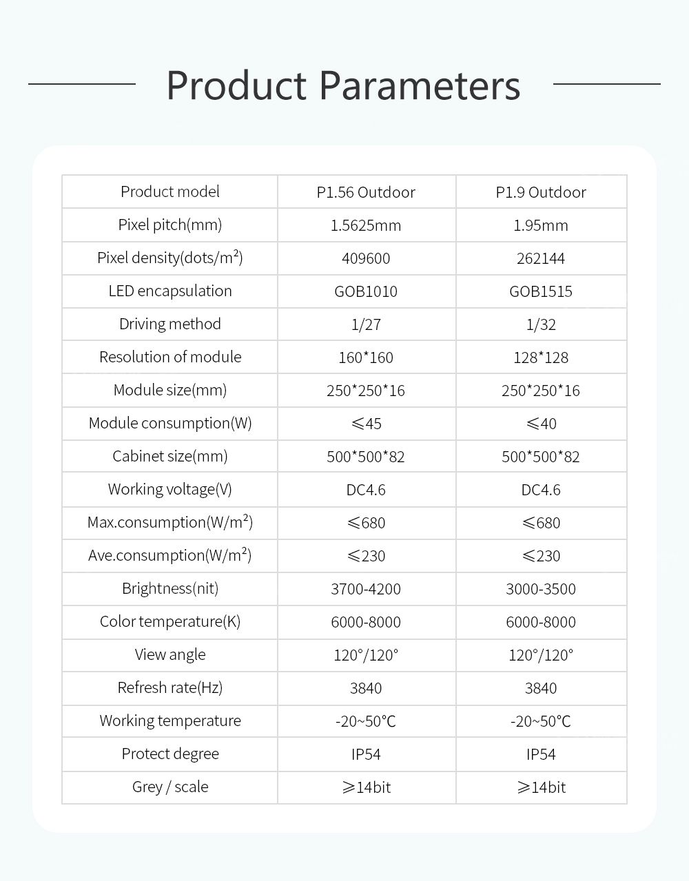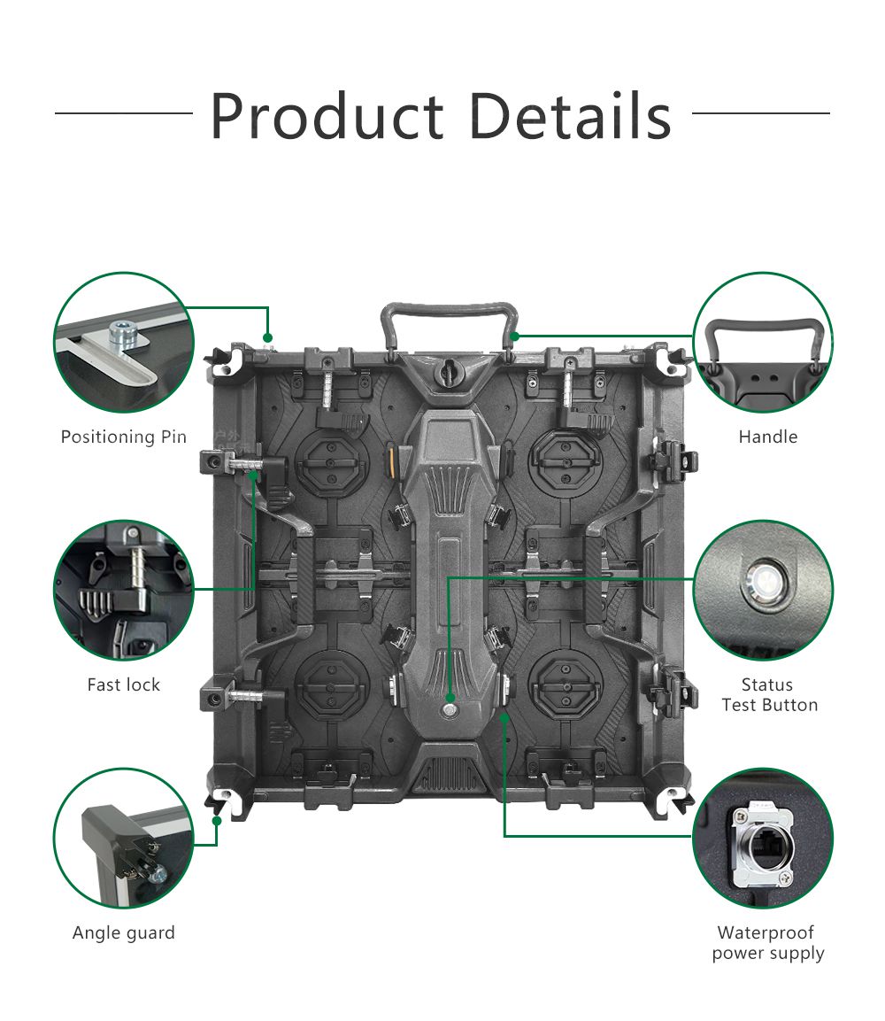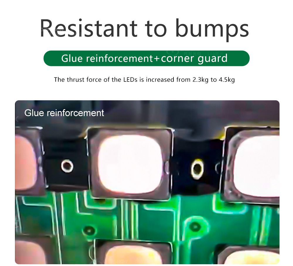 4 أداء حماية عالي: بالإضافة إلى تقنية تغليف GOB التي تستخدمها الوحدات، تم تجهيز الخزانات برؤوس نتوءات مضادة للتصادم وزوايا واقية؛ وبالتالي فإن سطح الشاشة يتمتع بحماية عالية، مما يتجنب إلى حد كبير التلف أثناء التركيب والنقل؛