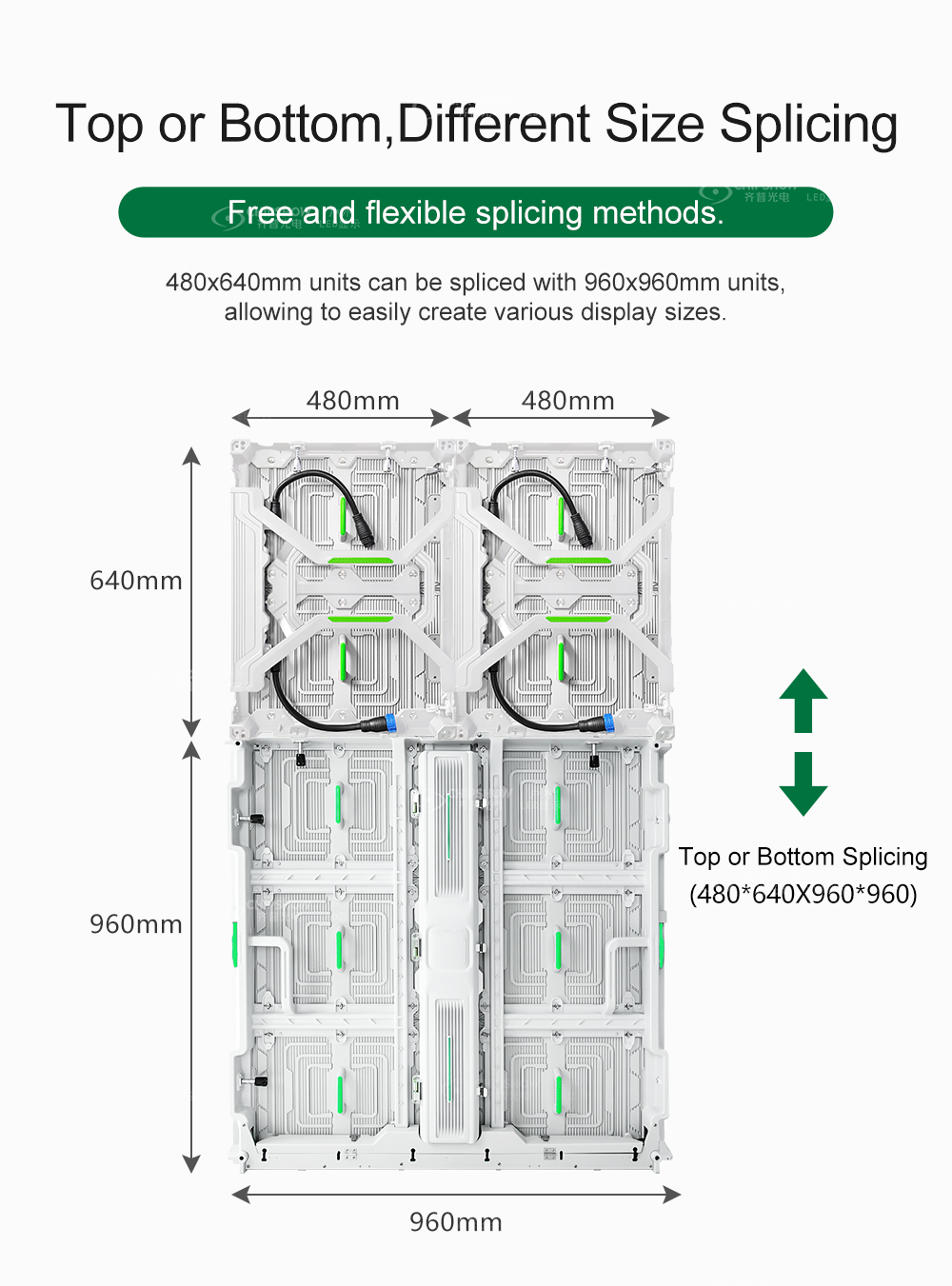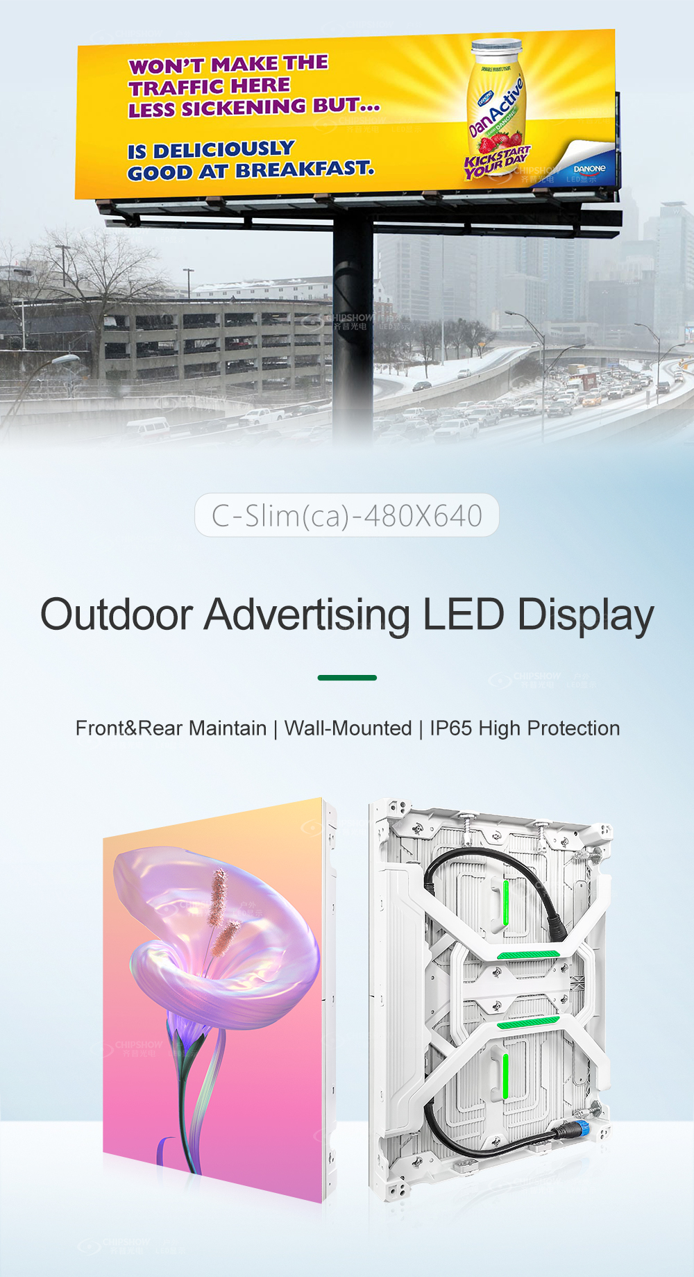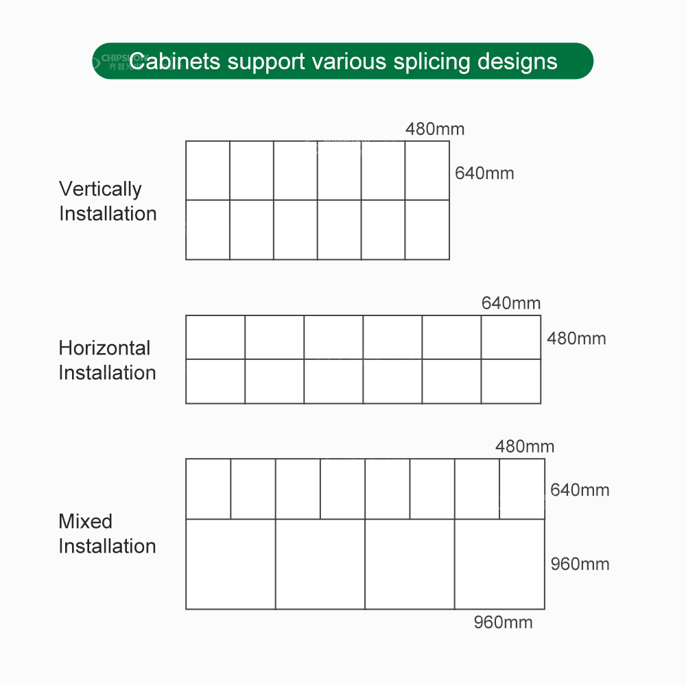 تجميع مرن: يوفر حجم الوحدة الصغير (480 مم * 640 مم) الراحة لمستخدمي تجميع أحجام مختلفة من اللافتات/اللافتات/اللوحات الإعلانية؛ كما أنه يدعم الوصل مع خزانات C-Slim كبيرة الحجم (الحجم: 960 مم * 960 مم)؛ على سبيل المثال، يمكن وصل شاشة عرض بنسبة عرض إلى ارتفاع 16:9 بسهولة؛