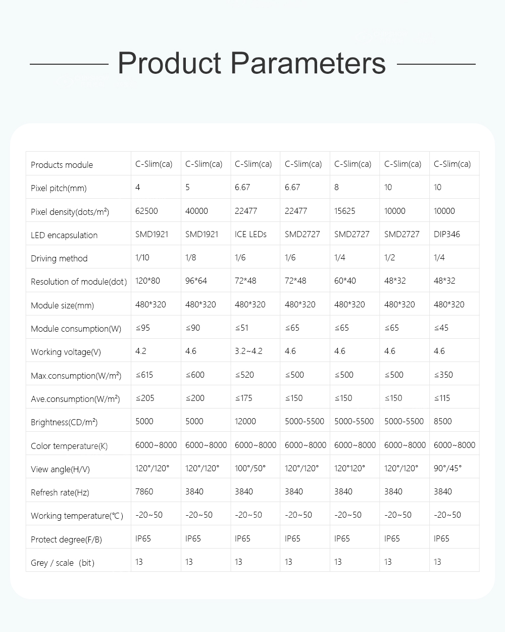 1 سطوع عالٍ، وتوفير الطاقة: تعتمد سلسلة C-Fit هذه مصدر طاقة منخفض الجهد 2.8 فولت/3.8 فولت يوفر كفاءة ممتازة في استخدام الطاقة، وفي الوقت نفسه، توفر خرزات ICE LED سطوعًا عاليًا مع استهلاك منخفض للطاقة؛ 2 جودة الصورة الدقيقة: إنها تستخدم دائرة طمس الحافة الرائدة للتخلص من الخطوط الشبحية بشكل فعال؛ ومع توازن اللون الأبيض تحت مستوى رمادي منخفض، فإنه يحقق جودة صورة جيدة بدون انحراف في اللون؛ 3 رفيعة للغاية: تستخدم الخزانة سبائك المغنيسيوم المصبوبة (وزن الخزانة الفارغة: ¼ 15 كجم، وزن الخزانة النهائية: ¼ 35 كجم؛ سمك الخزانة: 87 مم)؛ وهذا يجعل من السهل نقل وتركيب الخزانات. 4 دقة عالية: يتم تصنيع كل خزانة من خلال عملية الصب بالقالب وعملية CNC، وبالتالي، يمكن ربط كل خزانة بسلاسة؛ 5 مستوى حماية عالي: تصل درجة الحماية للجانب الأمامي للخزانة إلى IP65؛ يمكن لشاشات LED من سلسلة C-Fit أن تتحمل الظروف الخارجية الشائعة؛6 تبديد الحرارة عالي الكفاءة: يضمن نظام تبديد الحرارة المتطور ذاتيًا إمكانية تبديد الحرارة في أي ركن من أركان الخزانة بسرعة من خلال الضغط الحالي المزدوج والضغط السلبي. وهذا يضمن أن شاشة LED يمكن أن تعمل دائمًا بشكل طبيعي دون مشاكل تبديد الحرارة 7 تركيب سريع: كل خزانة متصلة بأقفال سريعة، ويستغرق الأمر 10 ثوانٍ فقط لربط خزانتين؛ 8 تطبيق واسع: كشاشة عرض مثبتة على الحائط/معلقة، يمكن استخدام سلسلة C-Fit على نطاق واسع في مجموعة متنوعة من الأماكن العامة الخارجية، مثل الملاعب ومراكز التسوق والأرصفة ومحطات الحافلات والمدارس وجوانب الطرق؛