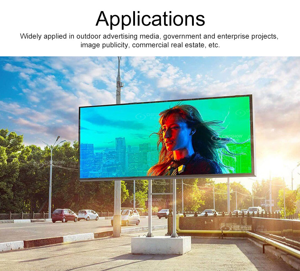 التطبيق: يمكن استخدامه على نطاق واسع لمجموعة واسعة من مشاريع الإعلان/البث الخارجية، مثل الإعلان/البث في المسابقات الرياضية، والإعلان عن العقارات، والدعاية لصور الحكومة/المؤسسات، وما إلى ذلك؛