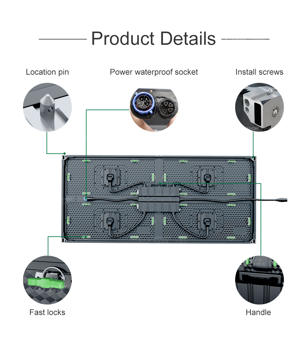 4 التوسع الذاتي: يمكن ربط الوحدات ذات الحجم الكبير (الحجم: 640*320 مم) بسلاسة بسبب تسطيحها الممتاز؛ يمكنك بناء شاشات بأحجام مختلفة بسرعة؛