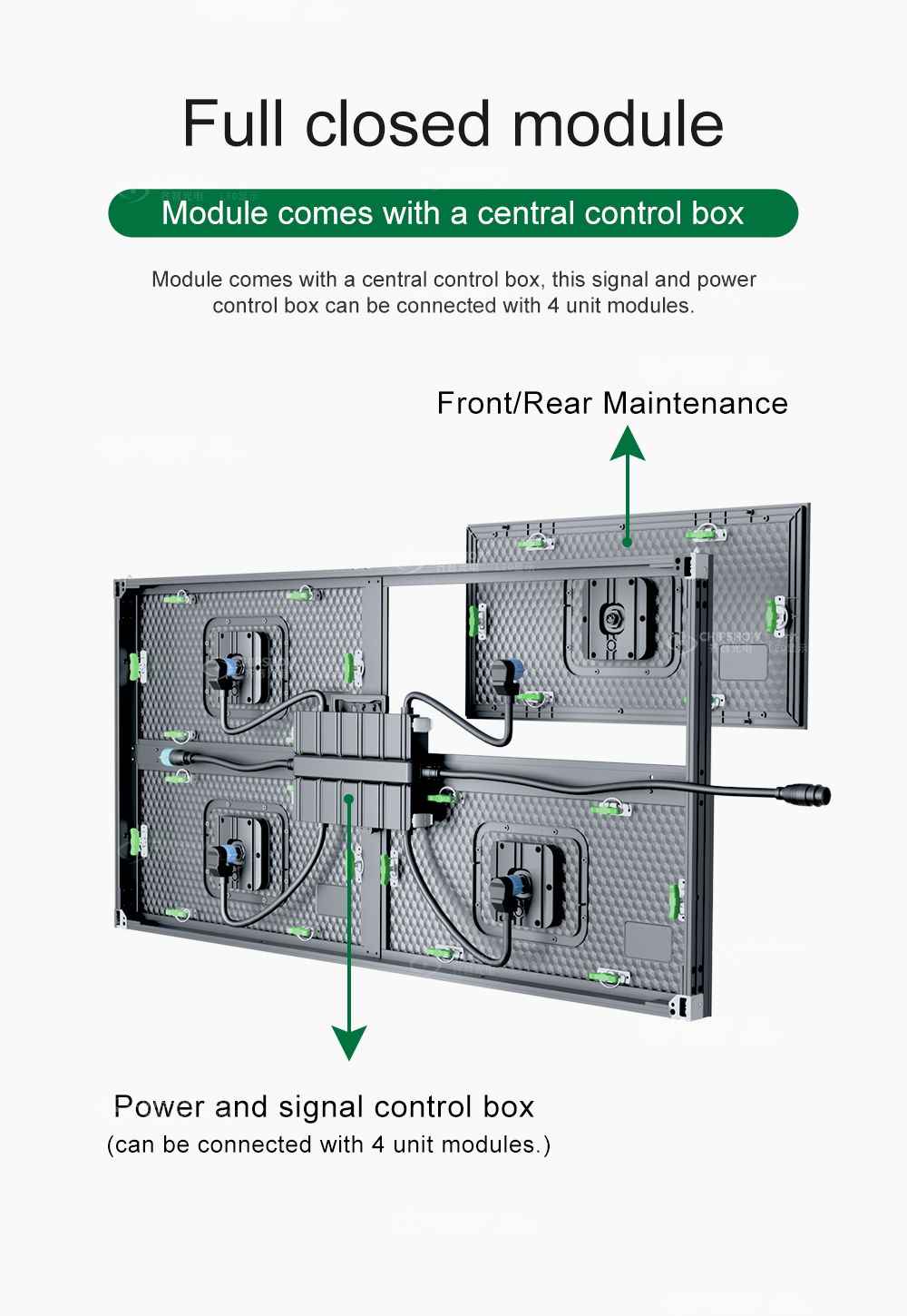 1 وحدات LED مغلقة بالكامل: تحتوي كل وحدة على صندوق تحكم مركزي وصندوق مصدر طاقة متصل بـ 4 نماذج وحدة؛