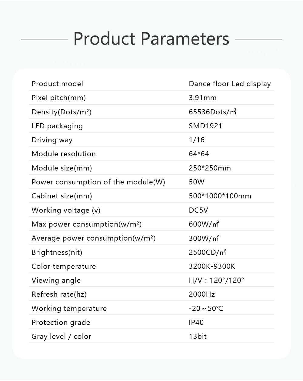 1 مقاوم للماء والرطوبة: تم تجهيز الغلاف السفلي والقناع وكابل الإشارة وكابل الطاقة بمواد مقاومة للرطوبة ومقاومة للماء، والخزانة مصنوعة من مواد منخفضة امتصاص الرطوبة، وتصل درجة مقاومة الماء للجزء الأمامي والخلفي من الخزانة IP40؛