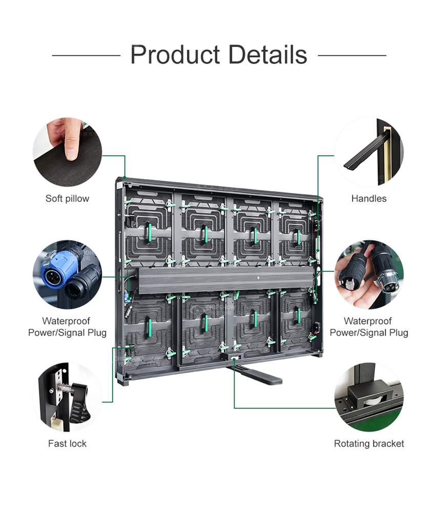 ◙ تأتي الخزانة مع دعامة دوارة بزاوية 90 درجة وأقفال سريعة يسارًا ويمينًا للتجميع الفعال لشاشة LED للملعب.