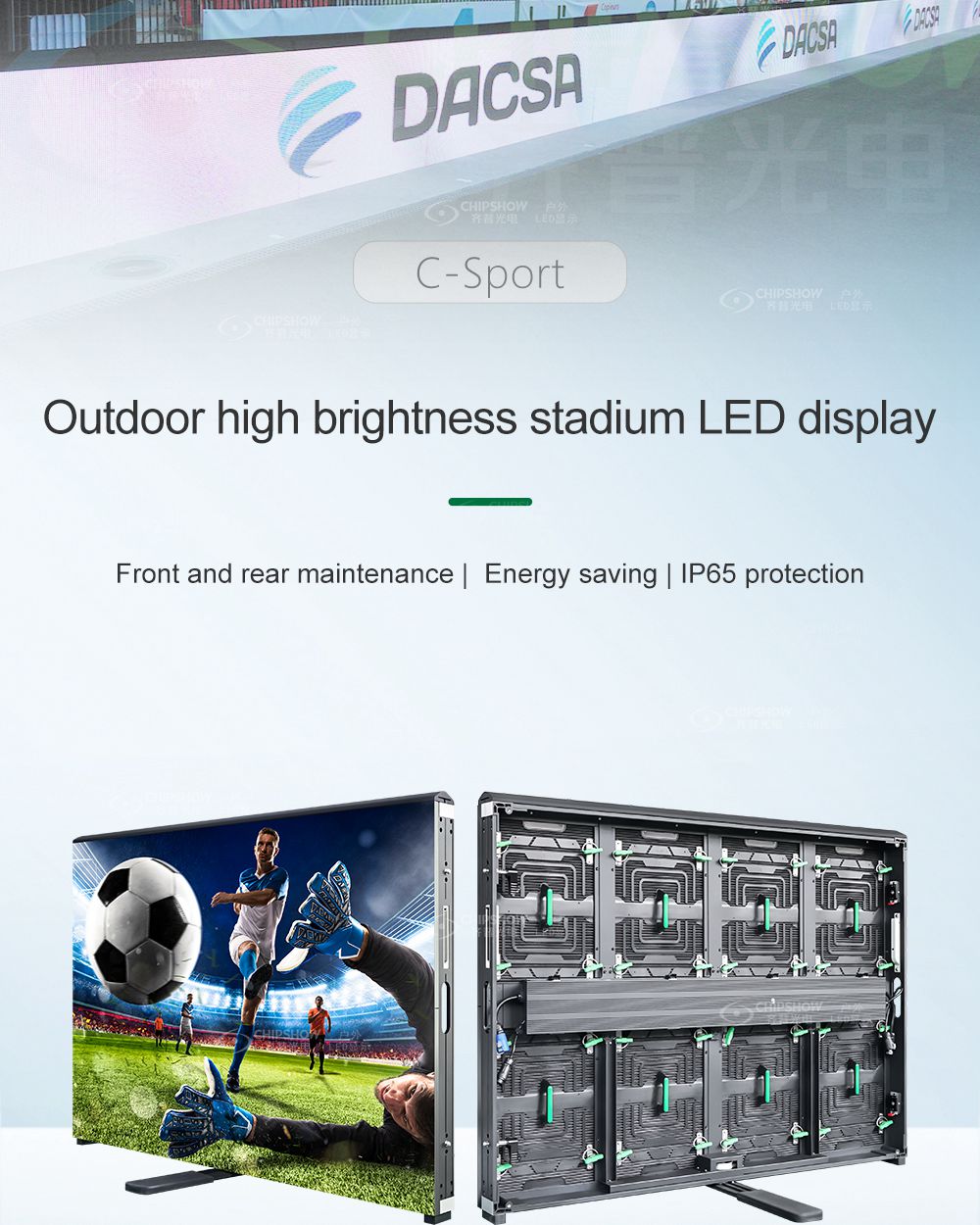 6 بالمقارنة مع شاشات عرض LED التقليدية، تعد سلسلة Chipshow C-Sport موفرة للطاقة - يمكن توفير حوالي 1/3 من استهلاك الطاقة؛ وهذا يقلل بشكل كبير من تكلفة التشغيل.