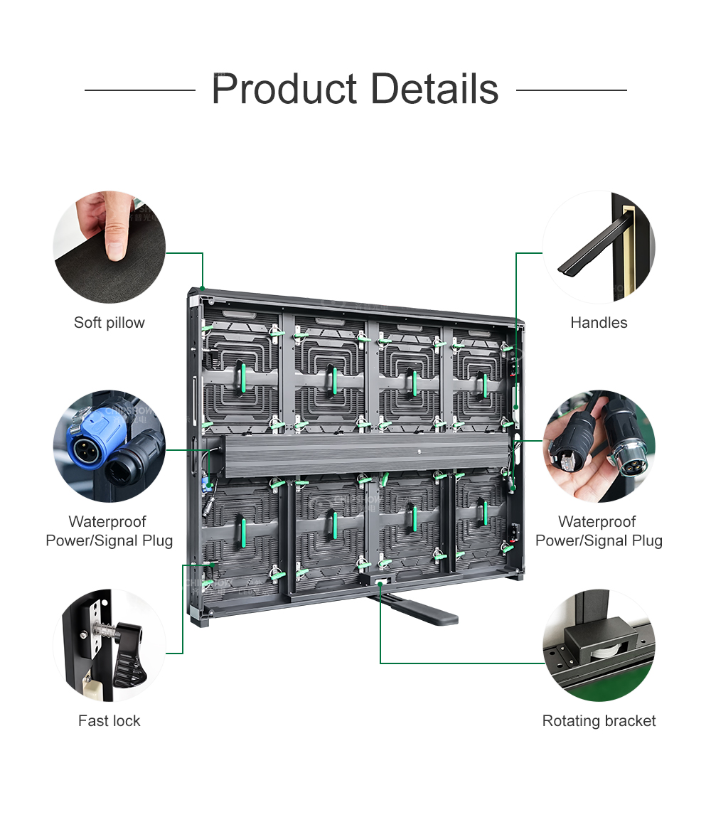 C-Lite-D عبارة عن شاشة LED للإيجار متطورة لمجموعة متنوعة من الأنشطة، ويمكن النقر على صندوق التحكم الخاص بها عن طريق الأقفال ووسادة الحماية التي تمنع المصابيح في الزوايا من التلف، وستوفر لك تجربة أفضل في التثبيت والتفكيك. سمات 1. الملعب المتاح: P2.6، P2.97، P3.91، P4.81 داخلي / خارجي 2. حجم الخزانة: 500*500 مللي متر/500*1000 مللي متر 3. السطوع: 800 ~ 1000nit (داخلي)، 4500 ~ 6500nit (خارجي). 4. مصدر الطاقة المتكامل وبطاقة الاستقبال. قم بالتوصيل والخروج خلال ثانية واحدة. 5. أقفال سريعة من أعلى وأسفل، يسارًا ويمينًا، 2 ثانية لتوصيل الخزانات. 6. ألومنيوم مصبوب بالقالب، قوة عالية، مثابرة عالية، دقة عالية، تسطيح عالي جدًا، خطأ تسطيح الشاشة بالكامل ≥ 0.01 مم. 7. تصميم مضاد للتصادم في الجزء السفلي من الخزانة، مع وضع الخرز على الجانب من أجل محاذاة دقيقة. 8. تصميم جيد لتبديد الحرارة، لا حاجة إلى مروحة ومكيف هواء، ضوضاء أقل أثناء العمل. 9. حماية عالية، مقاومة للتآكل بسبب الطقس ورذاذ الملح. 10. مجموعة متنوعة من طرق التثبيت، يمكن أن تكون رفع، ثابتة، التراص.