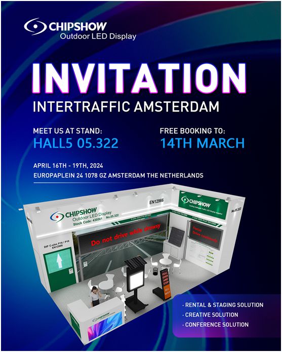 أعلنت شركة Chipshow LED Display هي إحدى الشركات الرائدة في مجال تصنيع شاشات LED من الصين أنها ستعرض مجموعتها الكاملة (شاشة LED الخارجية، إشارات المرور، VMS) حلول عرض LED المستقبلية لحركة المرور في Inter-Traffic Amsterdam Dutch ITA 2024 في الفترة من 16 أبريل إلى 19 أبريل 2024. رقم الجناح: القاعة 5، 05.322.