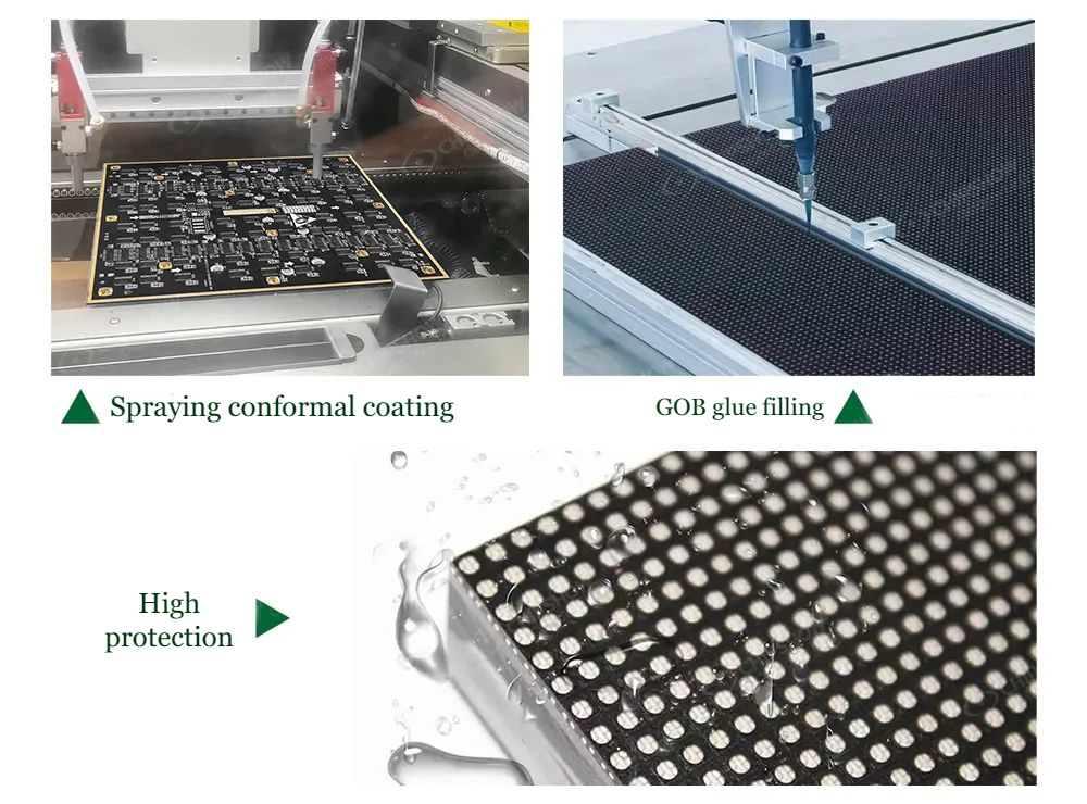 1. يجب أن تتمتع شاشة C-Lite-Plus P1.56، باعتبارها شاشة خارجية، بقدرات حماية قوية. قامت شركة Chipshow برش الطلاء المطابق على وحداتها وإضافة حلقات مطاطية مقاومة للماء. الجزء الأمامي من الوحدات مزود بمعالجة GOB وصب الغراء لحماية متعددة. تعمل الصناعة اليدوية على تحسين مقاومة الماء وتضييق الهواء بشكل كبير لـ C-Lite-Plus، ويمكن استخدامه بثبات في الهواء الطلق.